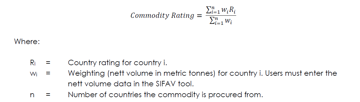 The Commodity Score is calculated by aggregating the various Country Scores into a single score representing all countries the commodity is sourced from. Nett volume (weight in metric tons) is used as a weighting factor.